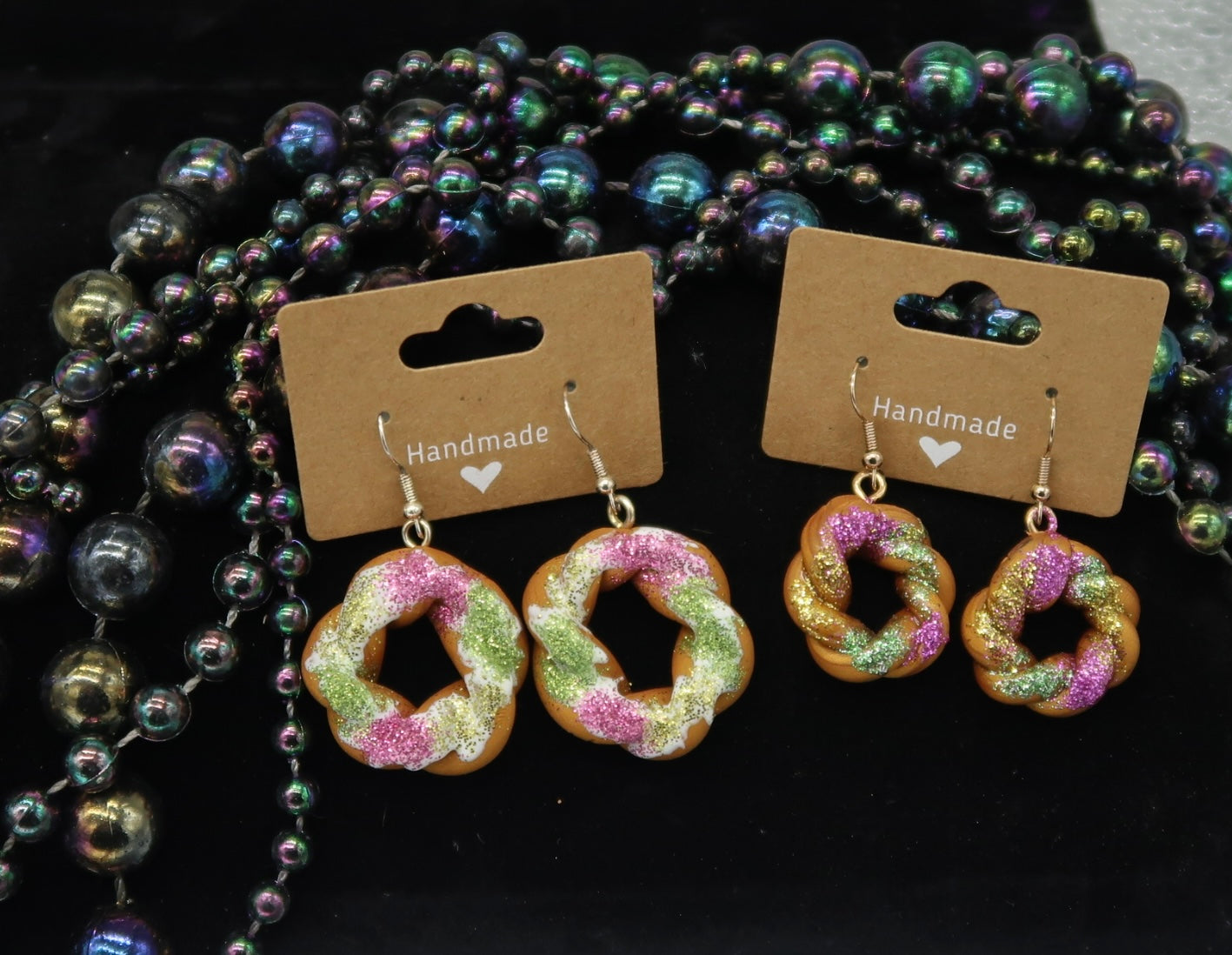 Nickel free handmade king cake earrings. Earrings are made of polymer clay, resin and glitter with option of clear or white icing.